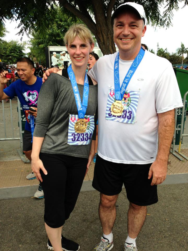 Now while I love taking my kids there–because my kids are pretty dang awesome–it hasn’t always been easy. First, there are 6 of them. And we lose some of them. A lot. (See previous post). Also, they need sunscreen. And slicking up six kids takes FOREVER. Then there is the whole food dilemma. They are picky and finding a restaurant where they all will eat is nearly impossible. (And it costs a fortune to feed them–churros alone could force you into bankruptcy. ) And so with that in mind Dave and I in recent years have taken to going to Disney once a year alone. And it’s awesome–I highly recommend it. I don’t have to lotion up anyone but myself and the top of Dave’s head, we get to eat wherever and whenever we want and I don’t have to carry or push anything! This year we had the pleasure of running in the Disneyland 10K–and it was AMAZING!!!